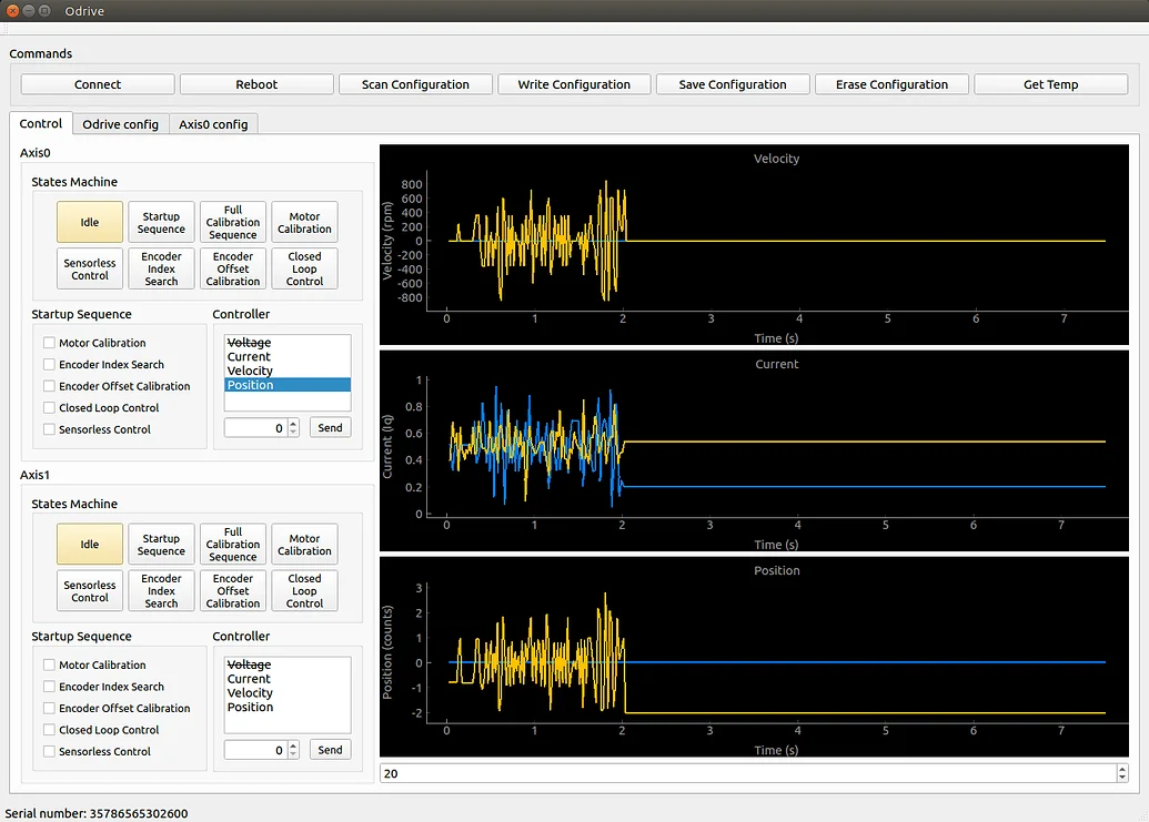 Пожалуйста, обратите внимание, Теперь нет линии, и шаговый/направленный интерфейс включен по умолчанию, и как режим управления позицией longODriveIn, он остается активным. По умолчанию, odrivestort в режиме управления позициями, поэтому вам не нужно passUSBSend какую-либо команду для запуска. Если вы хотите, вы все еще можете sendUSBCommand.