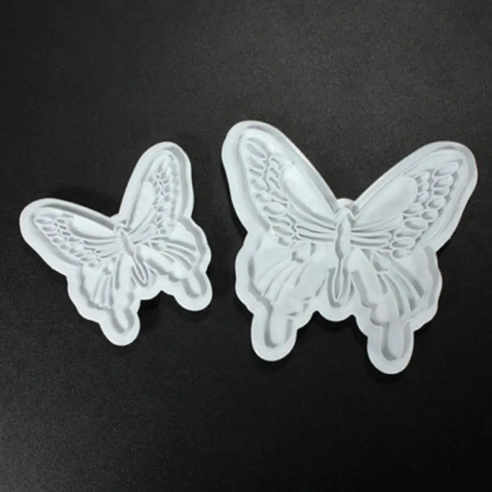 Материал: ПВХ Цвет: белый Вес: около 25 г Легко использовать и чистить. Размер: 9,5 см * 9 см и 6,7 см * 6,5 см Эти формы идеально подходят для использования с пирожными с помадой, сахарной пастой, лепестковой пастой, марципаном для приготовления пищи своими руками, печеньем или ремесленной глиной с вашим воображением. Комплектация: 2 шт./компл. x форма для резки бабочек