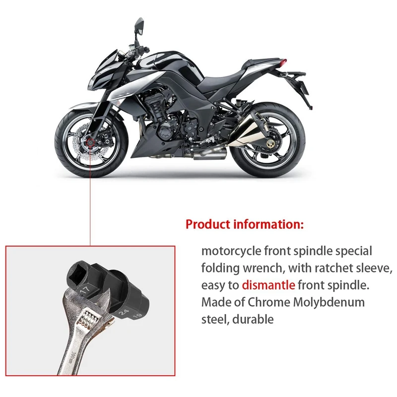 Инструмент с шестигранной осью мотоцикла специально разработан для установки, удаления или другой регулировки передней оси совместимых спортивных велосипедов и грязевых велосипедов. Этот инструмент необходим для выполнения технического обслуживания переднего колеса или передней оси вашего мотоцикла.