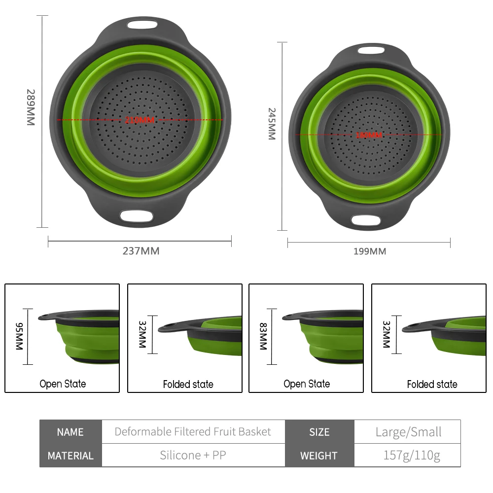 Материал: силикон Цвет: красный, зеленый, желтый, синий Размеры: Small-24.5x 18x8,3 см Large-28.9x 21x 9,5 см Складной дизайн, чтобы сэкономить место. Сохраняют фрукты и овощи в сухости. Может использоваться в раковине или поверх нее, отдельно стоящая на столешнице или столе.