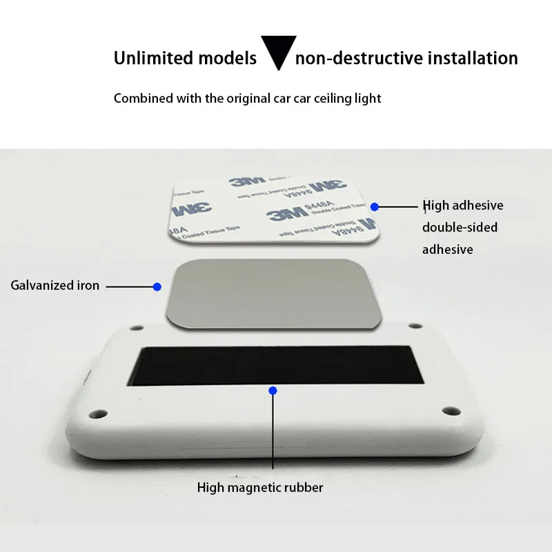 Благодаря Двухсторонней Клейкой Ленте фиксации и Железному листу, свет устанавливается на потолок автомобиля путем магнитного поглощения, не повреждая потолок автомобиля, который вам нравится.