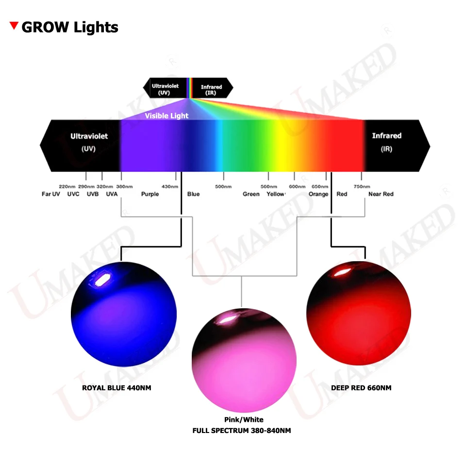 Полный спектр (380-840nm) розовый | Epistar | 45x45mil | 1 Вт | 3,2-3,4 | 300-350 | Одиночный | 100-110 |