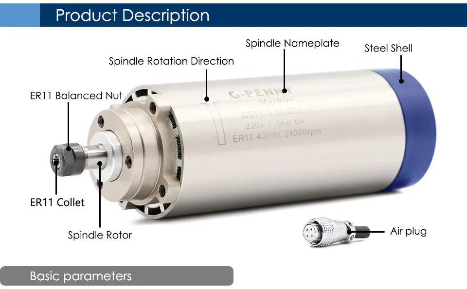 Напряжение:220vAC(Если вам нужен шпиндель 110 В/380 В, пожалуйста, оставьте нам сообщение, спасибо)