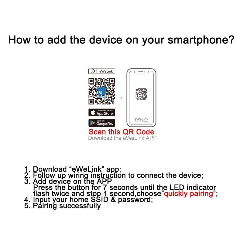 4. Нажмите кнопку сопряжения Wi-Fi в течение 5-7 секунд, пока синий светодиодный индикатор не начнет мигать дважды, а затем откройте приложение eWeLink и нажмите «+», выберите «режим быстрого сопряжения».
