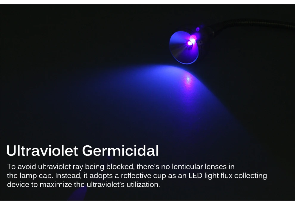 4. Чтобы избежать блокирования ультрафиолетовых лучей, в колпачке лампы нет линзовых линз. Вместо этого, он принимает отражающую чашку как светодиодный светильник, собирающий поток устройства, чтобы максимизировать использование ультрафиолета
