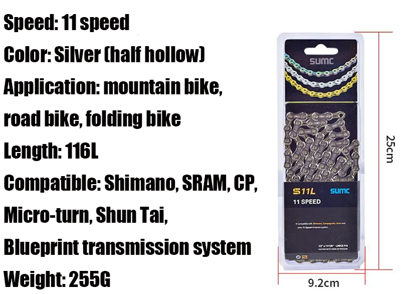 Название: цепь для горного велосипеда Типы: 8 /9 /10/11/12 скорость до половины полый Длина: 116 ссылки Скорость: 8/9 /10 / 11/12 скорости Цвет: серый/серебристый Вес упаковки: 8 скоростей полый: около 320 г 9 скоростей полый: около 275 г 10 скоростей полый: около 272 г 11 скоростей полый: около 256 г 12 Скоростей полый: около 250 г В штучной упаковке Использование: может использоваться для 8/9/10/11/12 скоростного MTB/шоссейного велосипеда/складного велосипеда.
