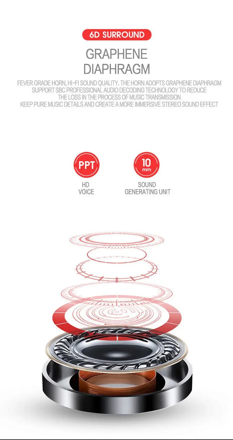 Bluetooth --------------------- Bluetooth 5,0 Декодирование ------------------- декодирование аудио Графеновая диафрагма Выносливость ----------------- 6H + 100H выносливость Корпус Meterial ----------------- ABS + PC Аккумулятор наушников -------- 3,7 V/60 мА · ч Аккумулятор для зарядки ---- 400 мАч Номинальная мощность ---------------- 20 МВт Чувствительность ветра пшеницы ----- -42 дБ почвы 3 дБ