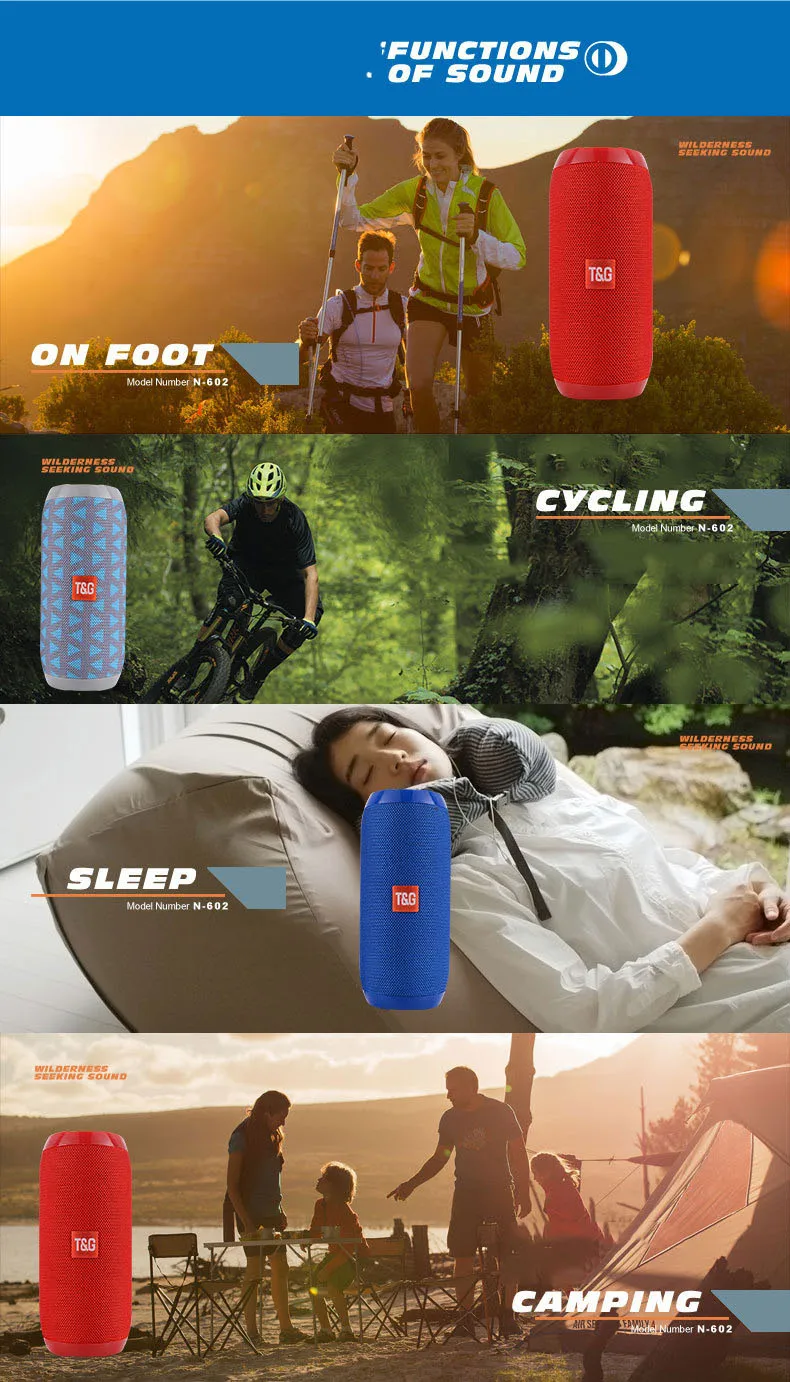 Feature: Support A2DP,AVRCP, Handsfree profile,FM radio Bluetooth Version:V4.0 Working Range:in 10metres Speaker:45mm Extended storage 32GB(not included card) Loudspeaker Output:5W Signal-to-Noise:≥95dB Distortion: ≤0.5% Battery Voltage/Capacity:1200mAh Battery Charging Voltage:5V±0.5V Battery Charge Time: 2-3hours Play time values for speakers :4-5hours Package List : T&G117 Bluetooth speaker x1; Charging cable for T&G117 x1;