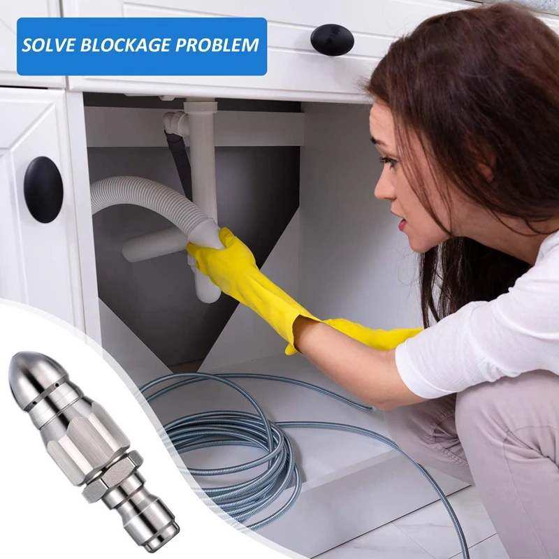 Решить проблему блокировки: Эта насадка для распыления канализации может быть подключена к быстрому разъему 1/4, чтобы сделать воду более мощной, что позволяет удалить эту воду, смазку, ворс, волосы, И т. Д., чтобы легко решить проблему блокировки сливных труб